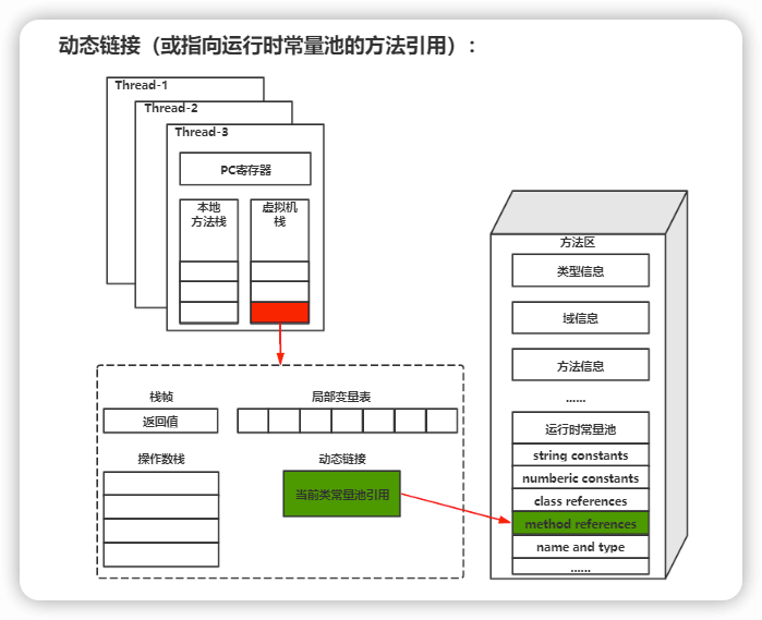 - 当该方法需要调用其他类和方法时,需要通过方法区中的运行时常量池存储的引用链接寻找,而栈帧的动态链接存储了调用方法对应在运行时常量池中的引用(如下图所示)